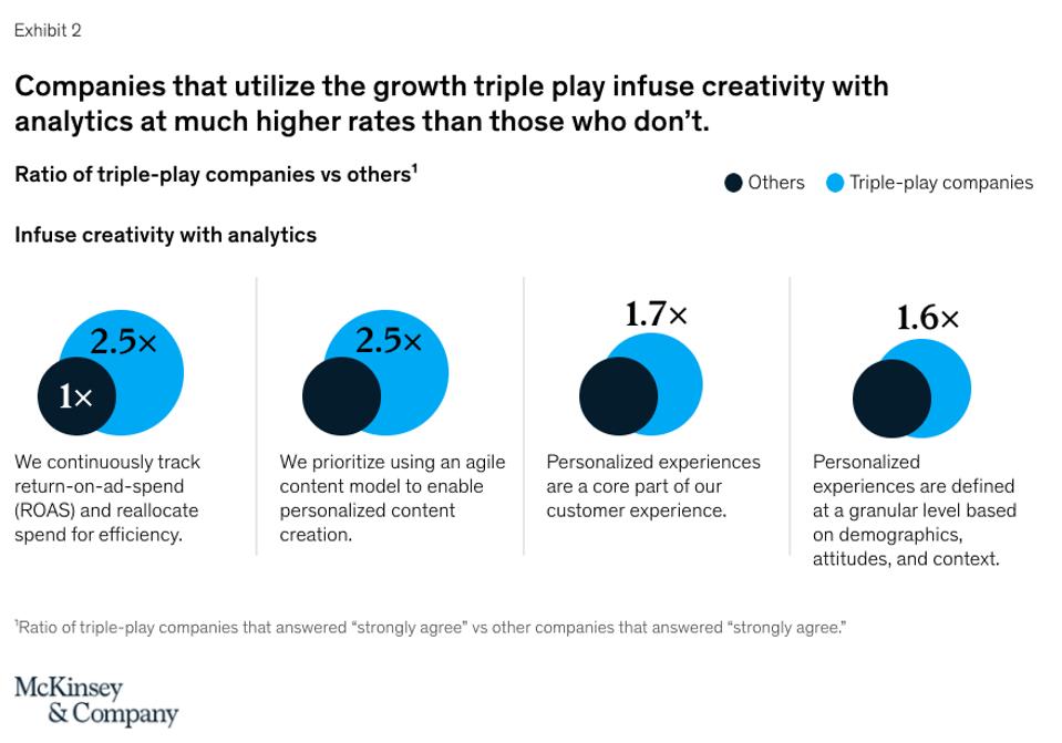 In its research, McKinsey also found that triple-play companies infuse creativity with analytics at much high rates than those that don’t. Examples include: