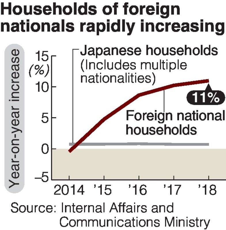 According to a survey by the Internal Affairs and Communications Ministry, the number of households of foreign nationals is rapidly increasing, reaching 1.39 million as of January 2018 -- an 11 percent increase from a year earlier.