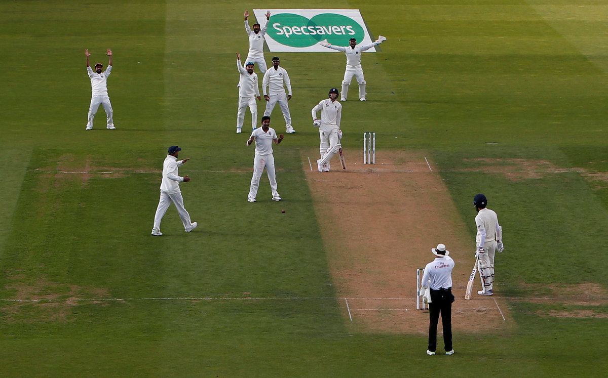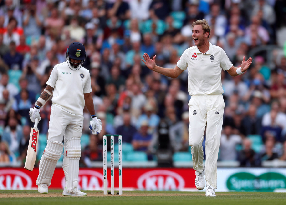 Broad played and missed numerous times, with Mohammed Shami and Jasprit Bumrah getting the ball to swing in chilly and slightly overcast conditions, before he fell to a brilliant diving catch by Lokesh Rahul at long on.