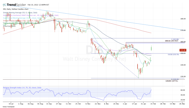 So now we keep this level on our radar. Above it triggers the monthly-up rotation and puts the recent range high in play near $164. Above that and Disney stock can begin filling the gap from its last post-earnings dip, putting the declining 200-day moving average on the table.