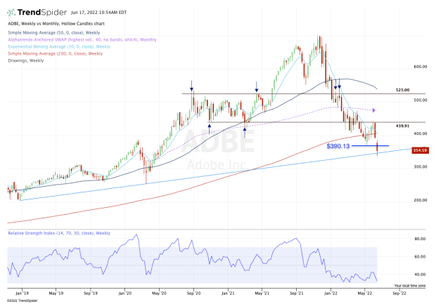 Adobe stock went on to break below $440, which was a key support level in 2020 and 2021. Then that level became resistance once the stock tried to rally.