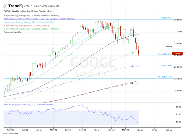 If we get a bounce here, we need to see if Alphabet stock can fill the gap near $2,370. That doesn’t show up on the weekly chart above, but it’s there. Above that and prior support at $2,500 is on the table.