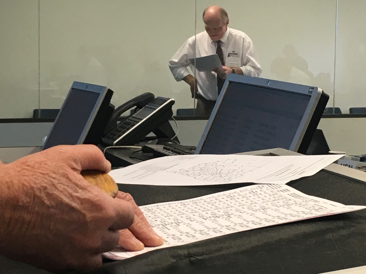 Sharp, the chief auctioneer at Macdonald & Co Woolbrokers, uses an abbreviated swing of his gavel to swiftly work through the day's offerings.