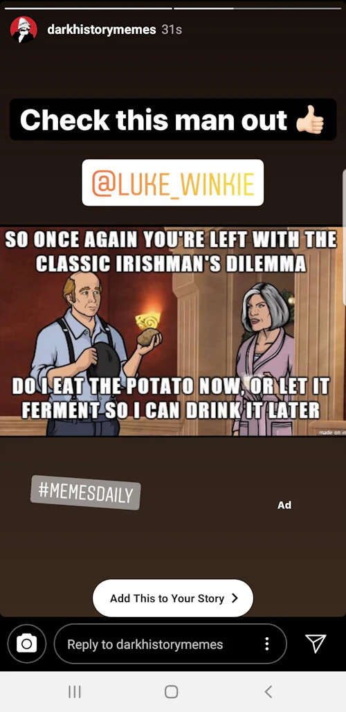 Sometimes, Riley likes to buy shoutouts on Instagram pages that serve a radically different population than those he usually reaches. It's his own way of diversifying his portfolio. Generally though, he admits, "meme pages do the best."