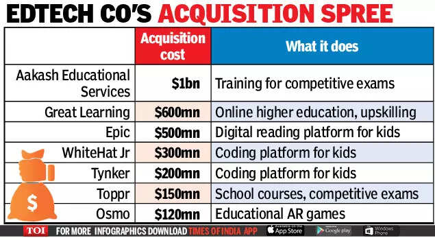 Byju's has made a slew of acquisitions in recent years. The most recent was that of hte US-based K-12 creative coding platform Tynker for $200 million (Rs 1,500 crore), part of an effort to consolidate its presence in the US.