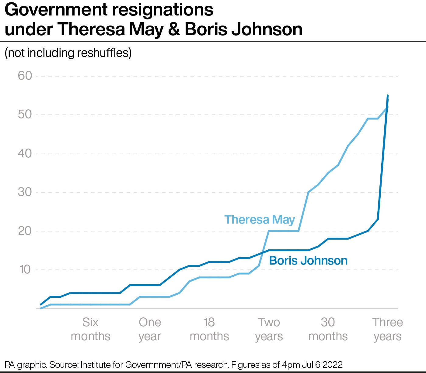 The mass resignation was triggered by Tuesday’s departure from Cabinet of Rishi Sunak and Sajid Javid, along with the resignation of solicitor general Alex Chalk.