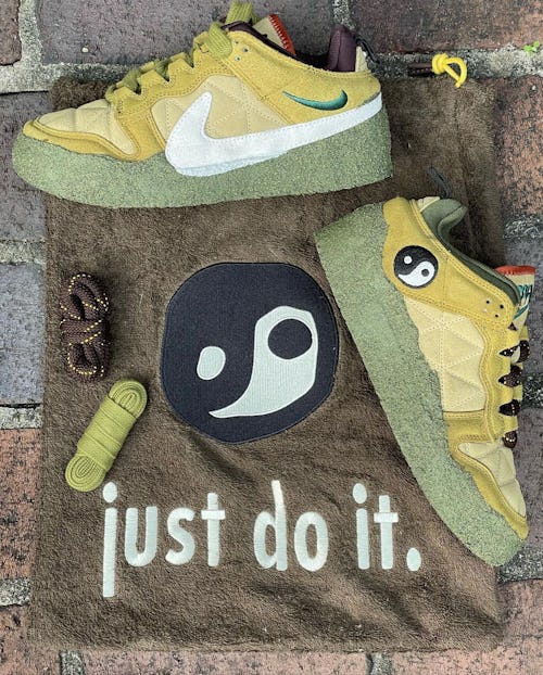 Cactus Plant Flea Market’s second Dunk aligns itself more with the brand’s DIY aesthetics than its previous version of the sneaker, which was covered in Swarovski crystals and glistened like a disco ball. Climbing and gardening, two activities whose aesthetics have become widely adopted within fashion and streetwear, provide clear inspiration for the more rugged successor.