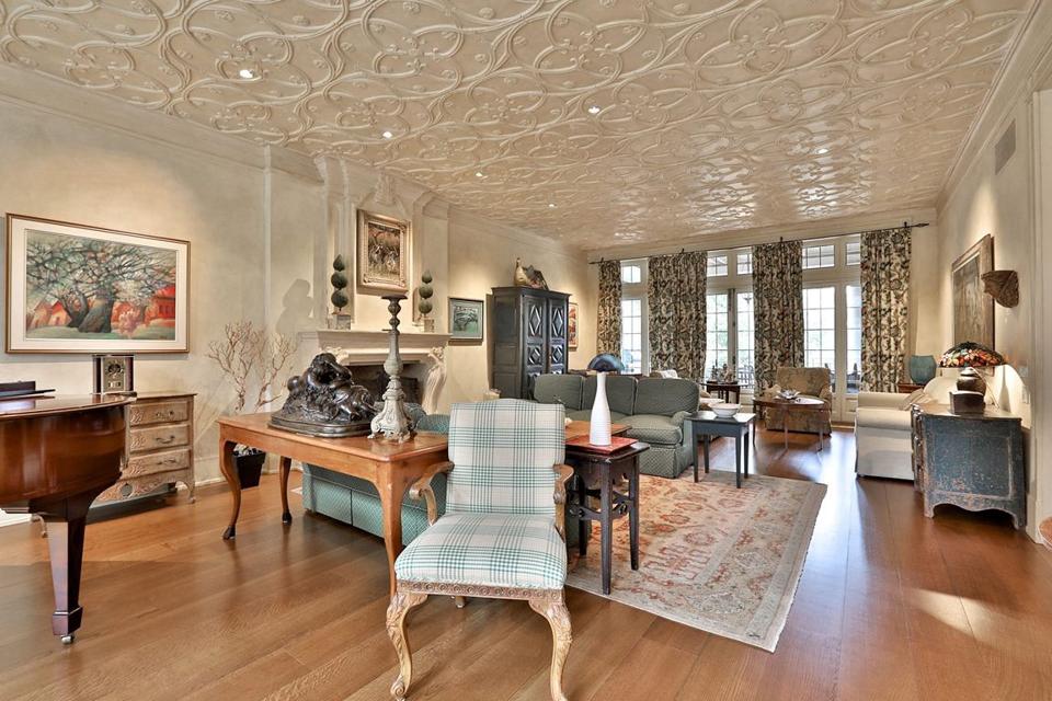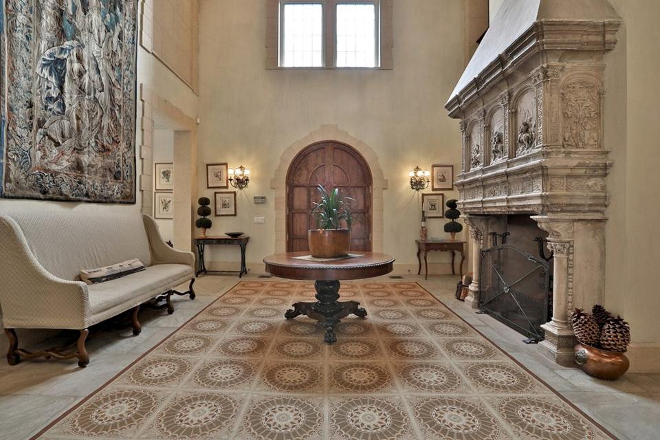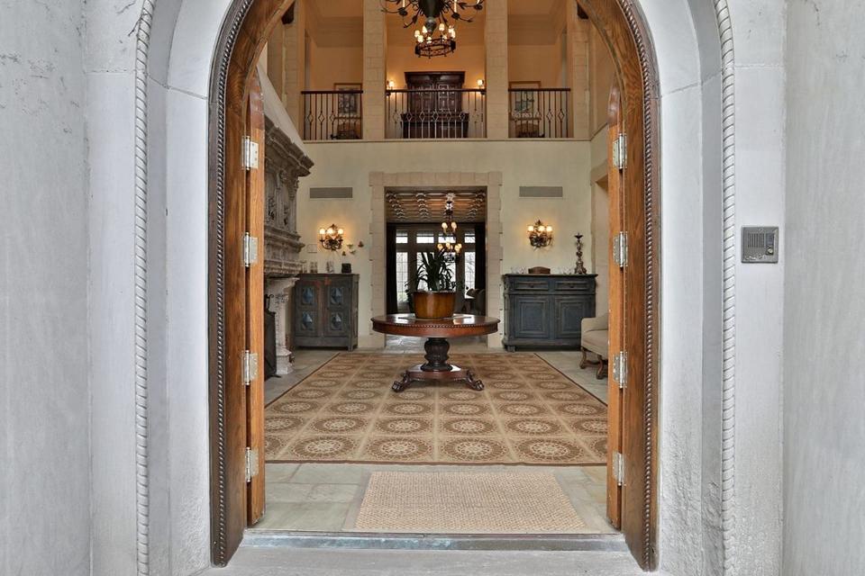 A cathedral ceiling and an ornate open hearth fireplace set the tone in the foyer. The room accesses the main living areas, which feature high ceilings, leaded windows, solid oak doors and fireplaces. Intricate ceiling moldings, millwork and stone floors add to the character.