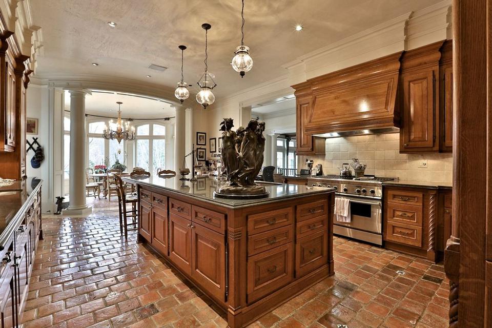 The kitchen adjoins a light-filled rotunda breakfast room and a butler’s pantry. Features include a heated terracotta tile floor, glass-front display cabinets, pendant lights and granite countertops. The center island has double sinks. A recessed paneled archway leads to a service hall.