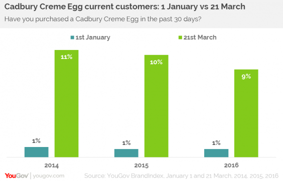 Many consumers were appalled at the news and a survey by UK pollster YouGov found that, whereas customer satisfaction with Creme Eggs has previously increased in the run-up to Easter, the reverse has happened since 2015.