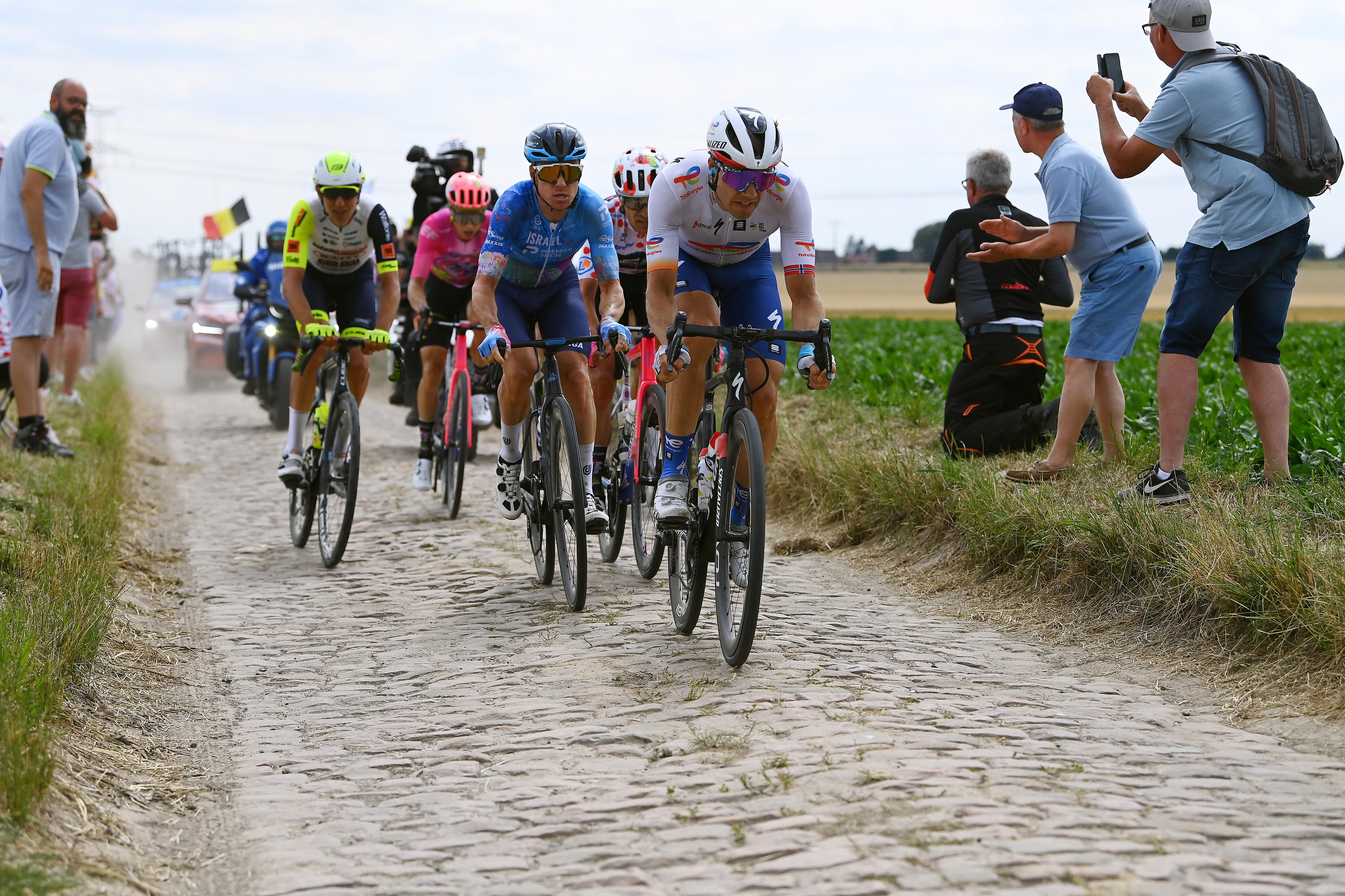 The 153.7-kilometre trek through the flat landscape of northern France included 11 spaced-out cobblestone sectors that caked the riders in dirt and reduced visibility as they powered over the jarring, uneven surfaces, creating clouds of sand-coloured dust.