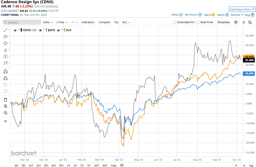 CDNS stock prices have soared 31.4% over the past 52 weeks, notably outperforming the Technology Select Sector SPDR Fund’s (XLK) 27.7% gains and the S&P 500 Index’s ($SPX) 17.9% returns during the same time frame.