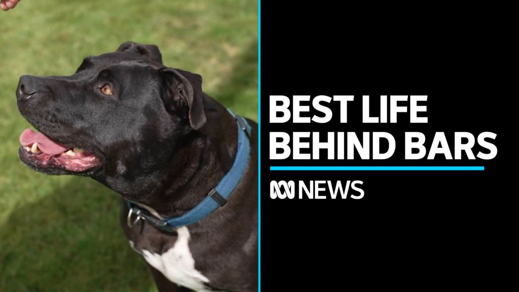The 10-year-old Staffy-Labrador cross now lives the life of a rockstar at the Ron Barwick Prison in southern Tasmania after he was adopted by dozens of inmates.