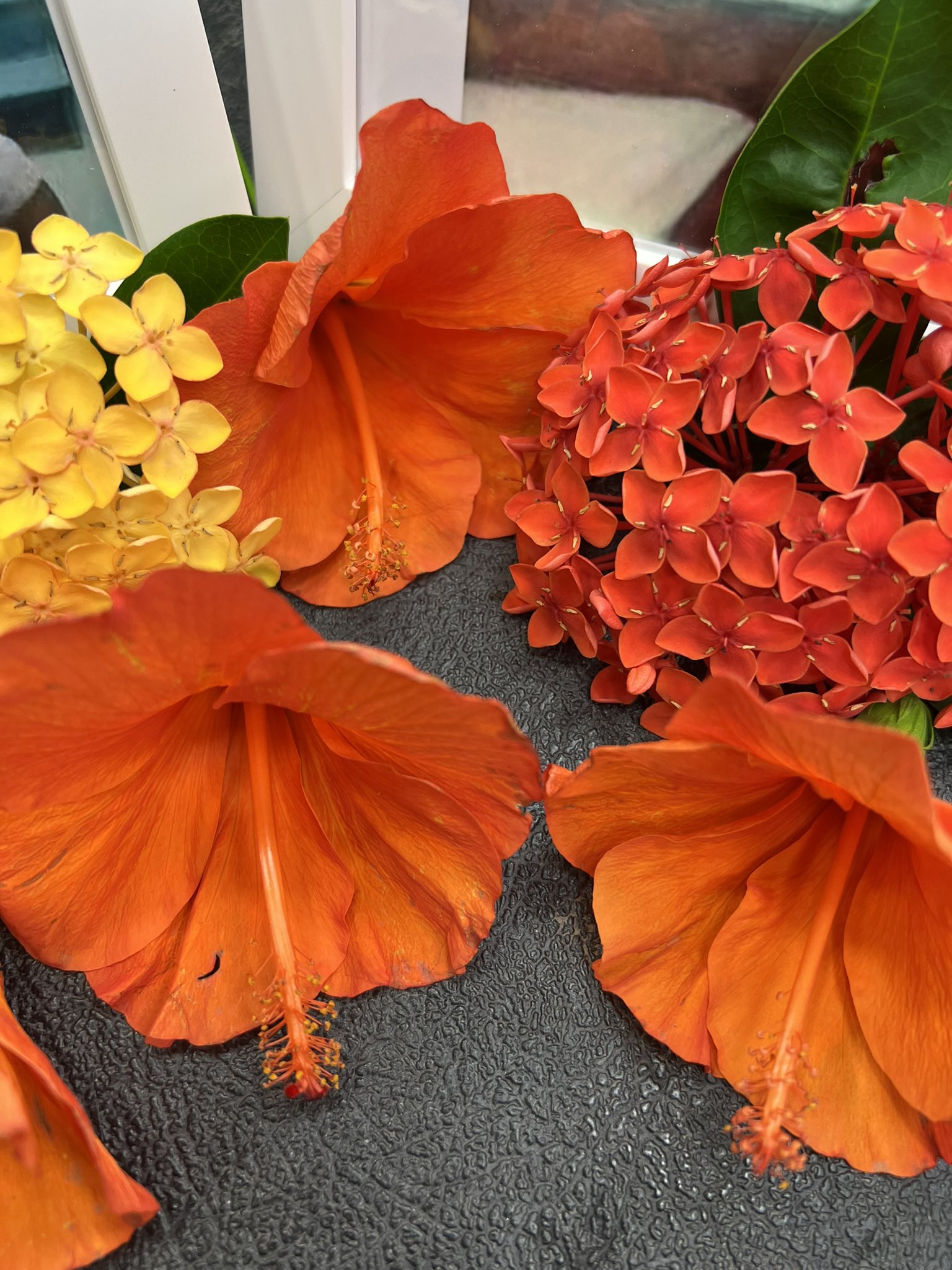 Two photos of Ms Bernard sat in front of the bench, with flowers scattered around them.