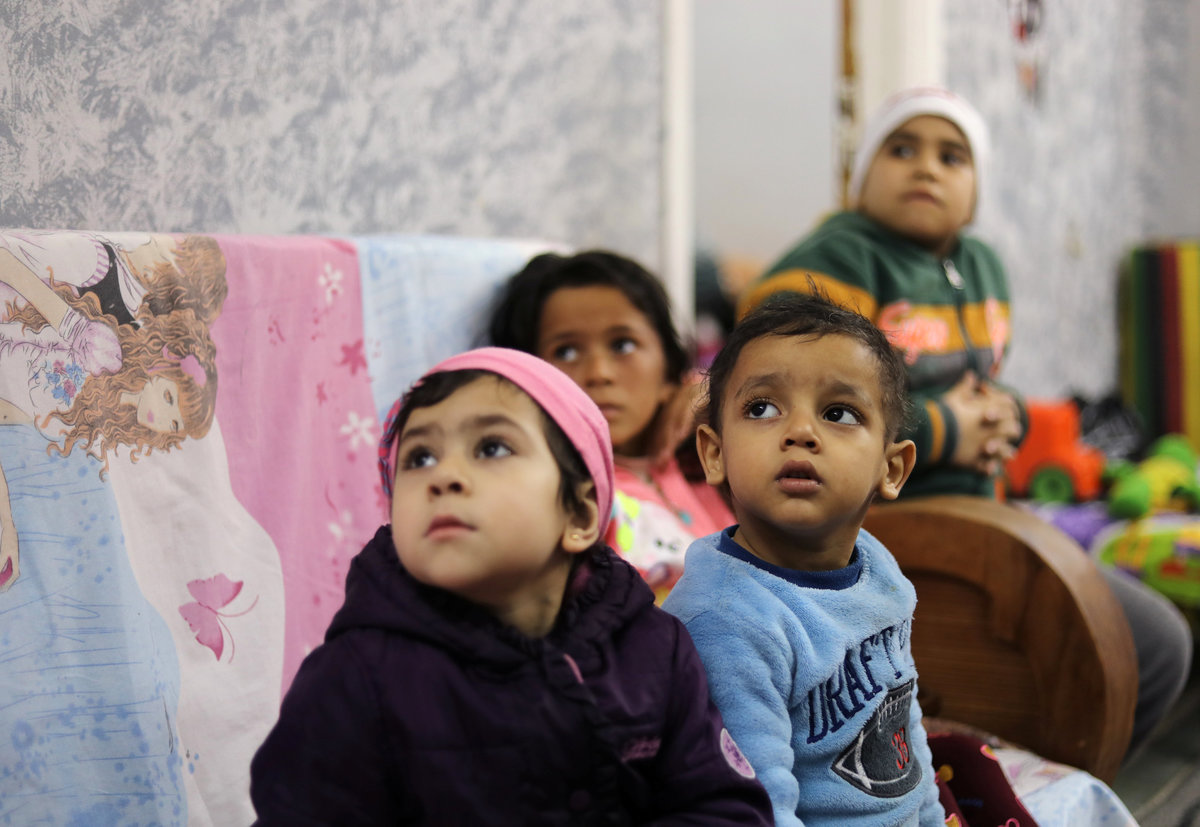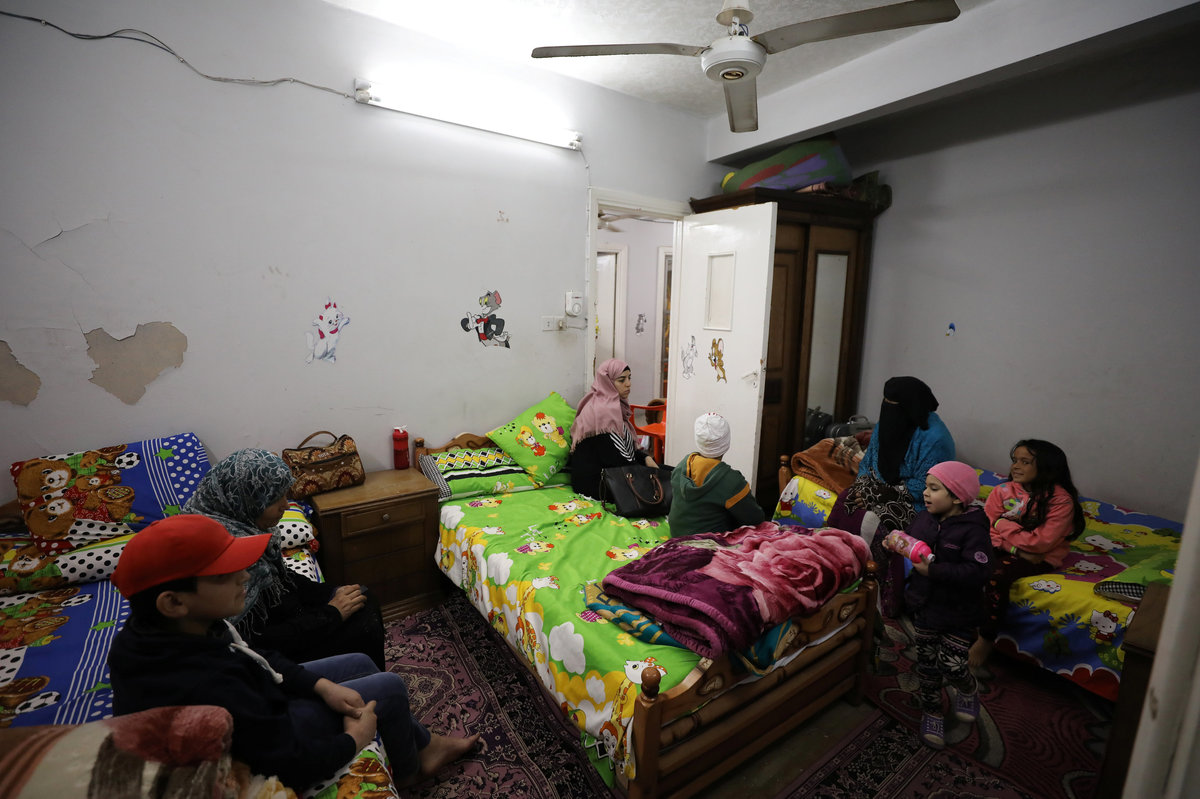 Abdelrahman (L), 14, Seif (C), 9, Retaj, 2, and Israa (R), 9, who were diagnosed with cancer, sit with their relatives at Zaza Ogaz's free housing for patients receiving treatment at a nearby cancer hospital, in Cairo, Egypt February 12, 2018. REUTERS/Mohamed Abd El Ghany