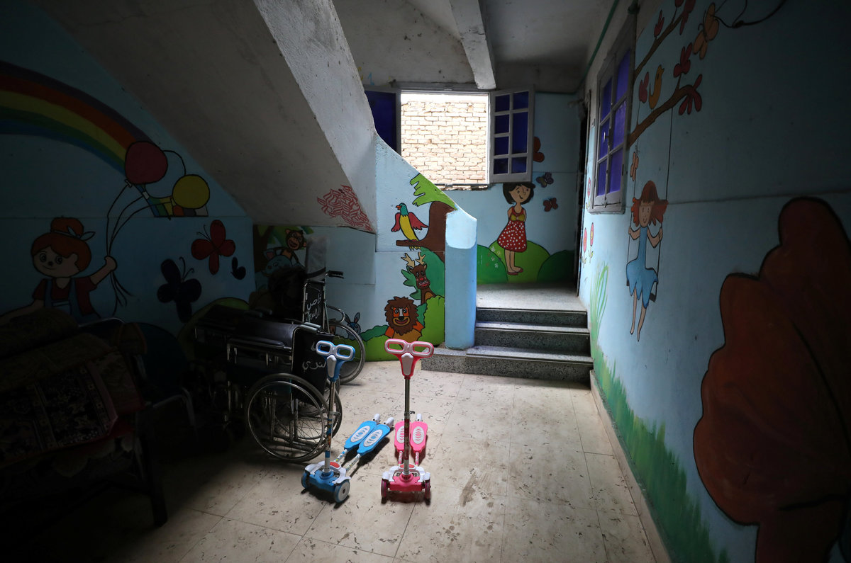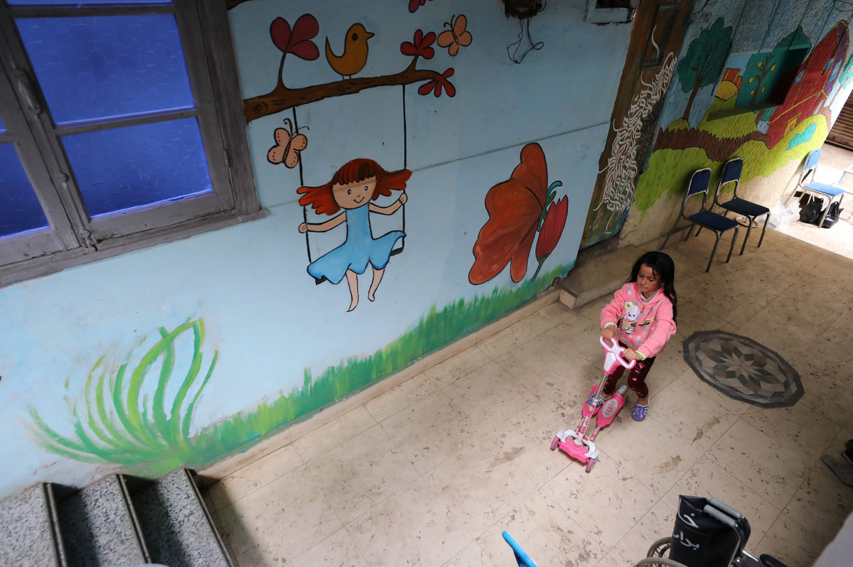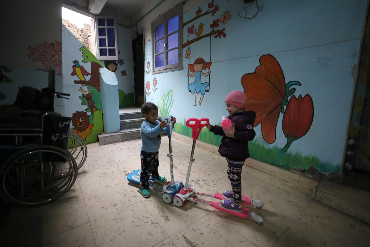 In the entrance hall, children's scooters are parked next to wheelchairs. In a bedroom decorated with cartoons of Winnie the Pooh and Minnie Mouse, children watch television. Some have traveled with their families from distant parts of Egypt.