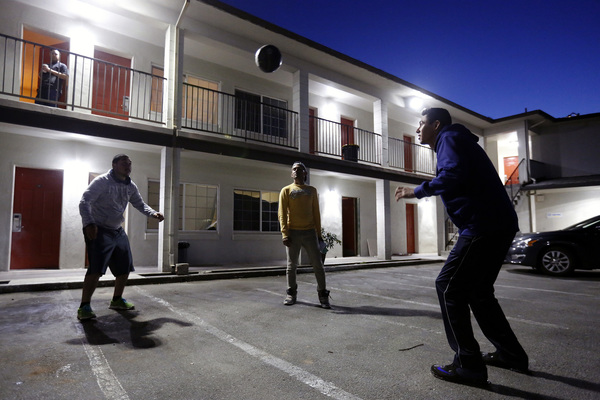 Workers pass their evenings kicking a deflated soccer ball across the cracked asphalt of the interior parking lot, with sawhorses as goal posts. When the sun sets, they wander alone to a quiet spot, or lie under the covers of their bunks and whisper into their phones to wives and children they won't see for months.