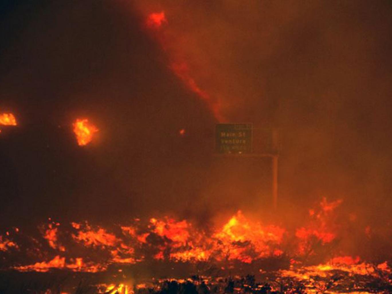 More than 600 fire fighters battled the blaze in Ventura County from ground and air but they were unable to prevent the closure of part of a major motorway, Highway 101.