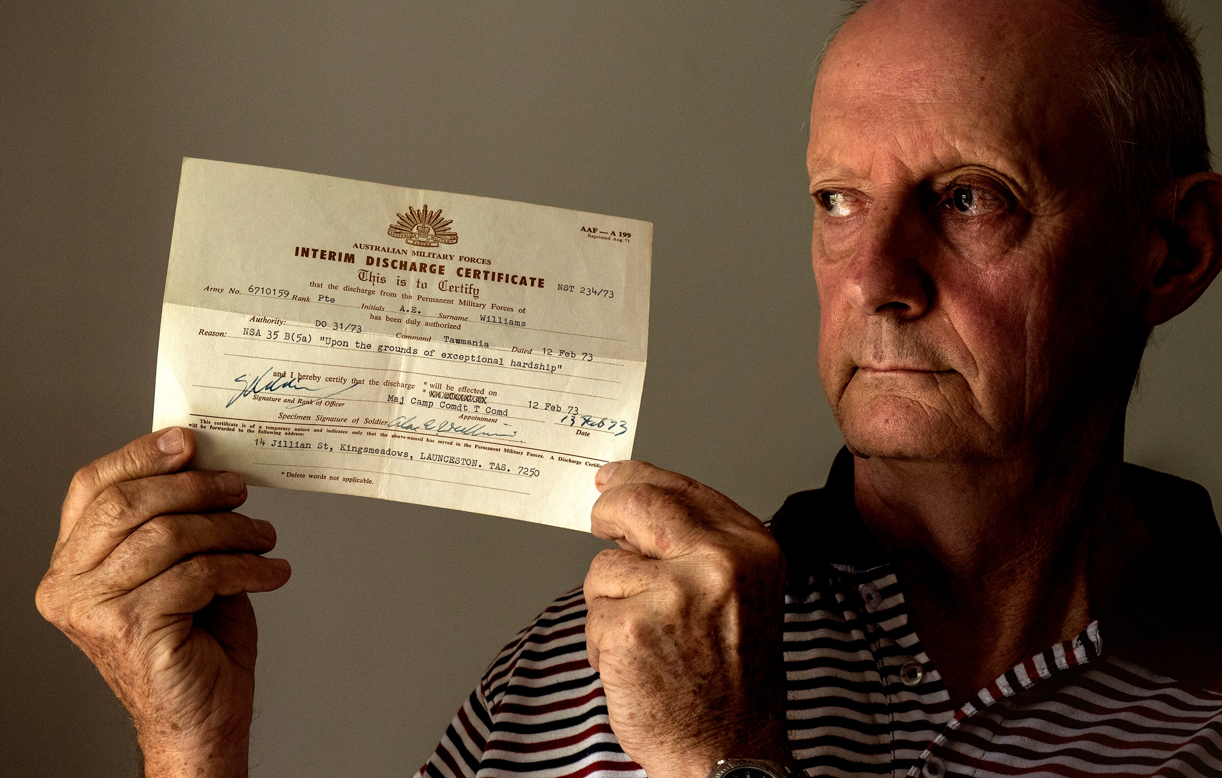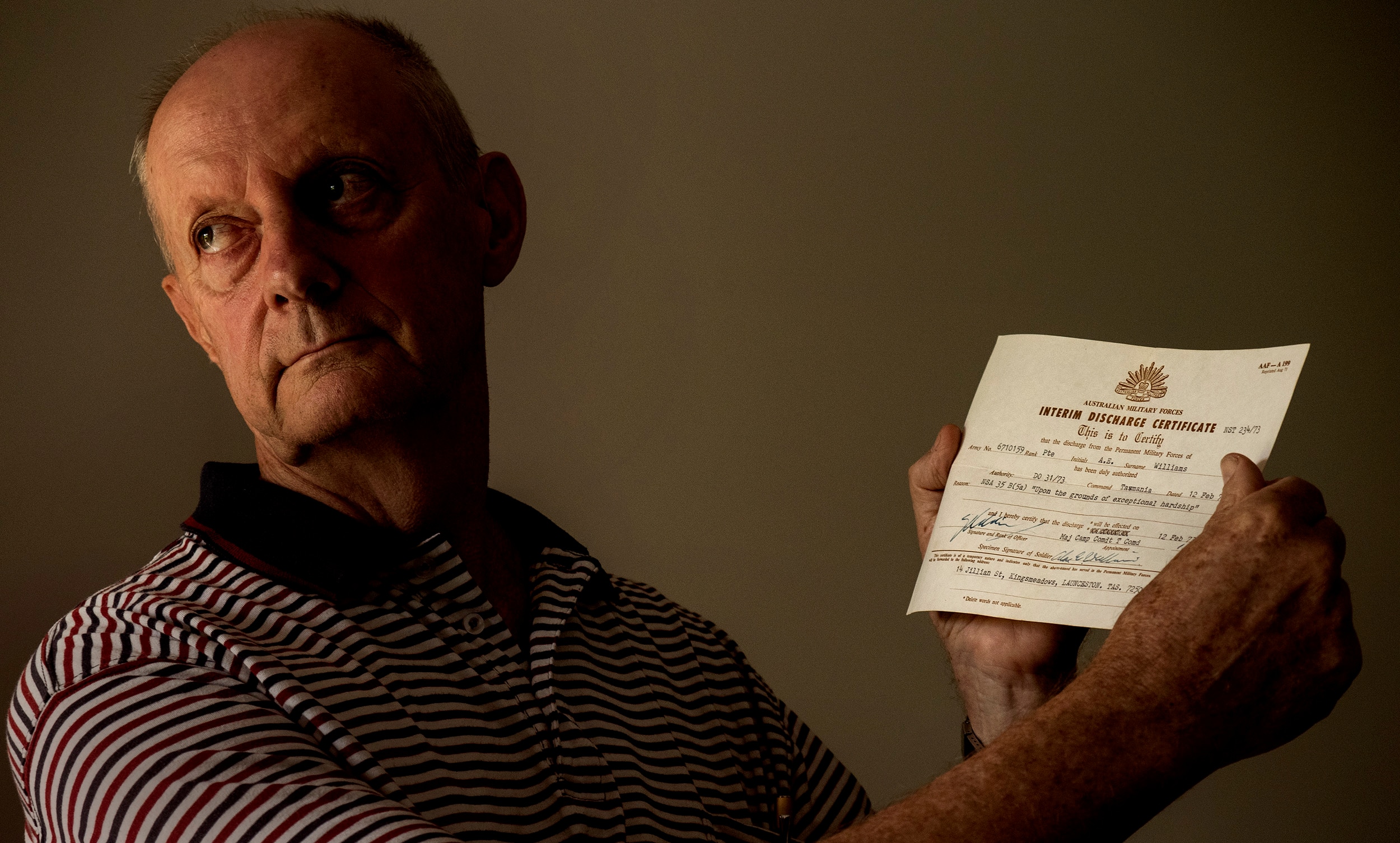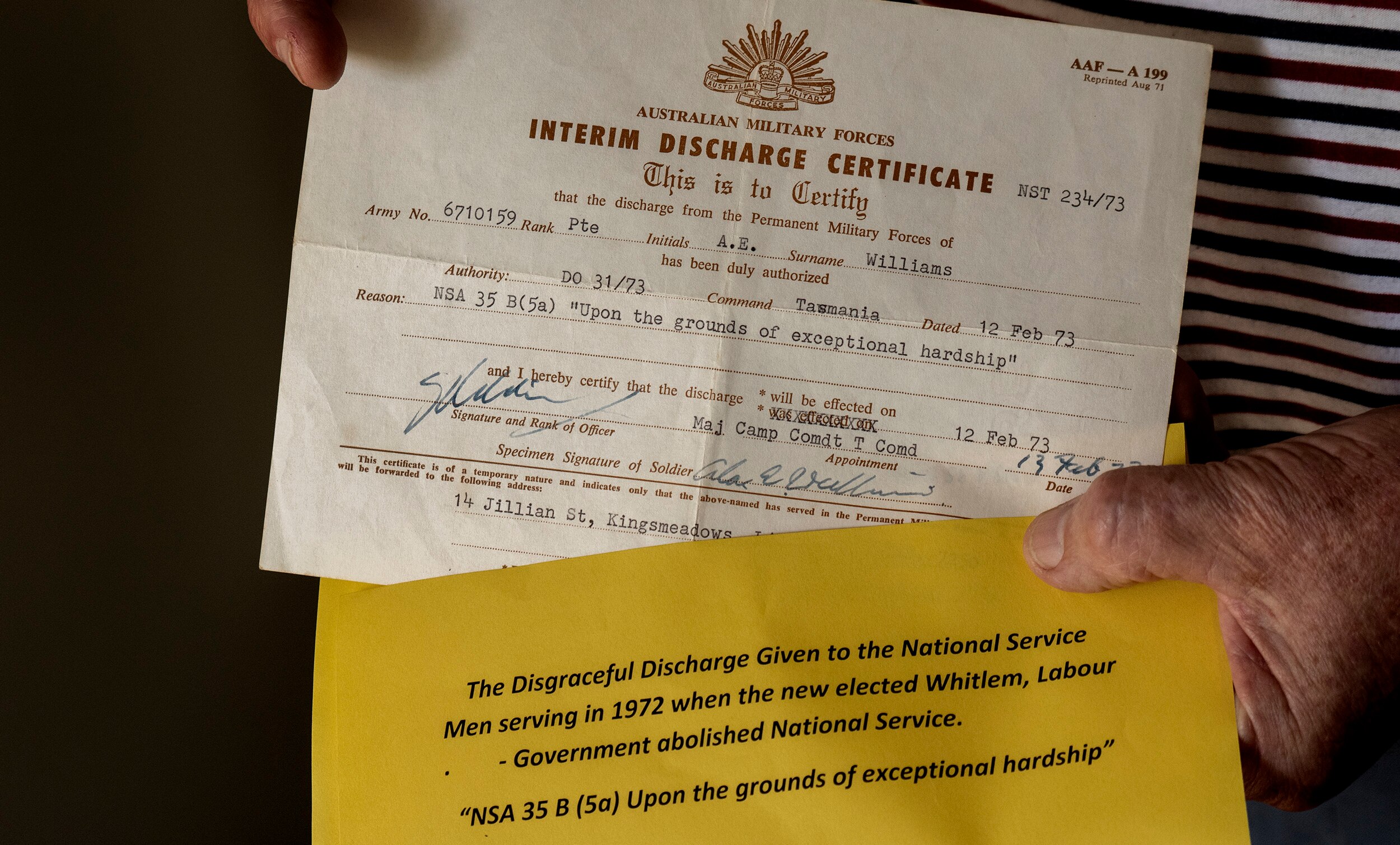 In February 1973, Then-Private Williams was issued an Interim Discharge Certificate by the Australian Military Forces, citing "upon the grounds of exceptional hardship" — words that have haunted the former conscript ever since.