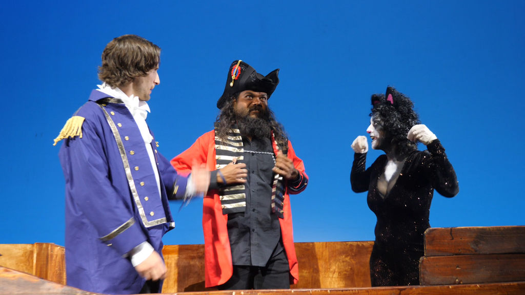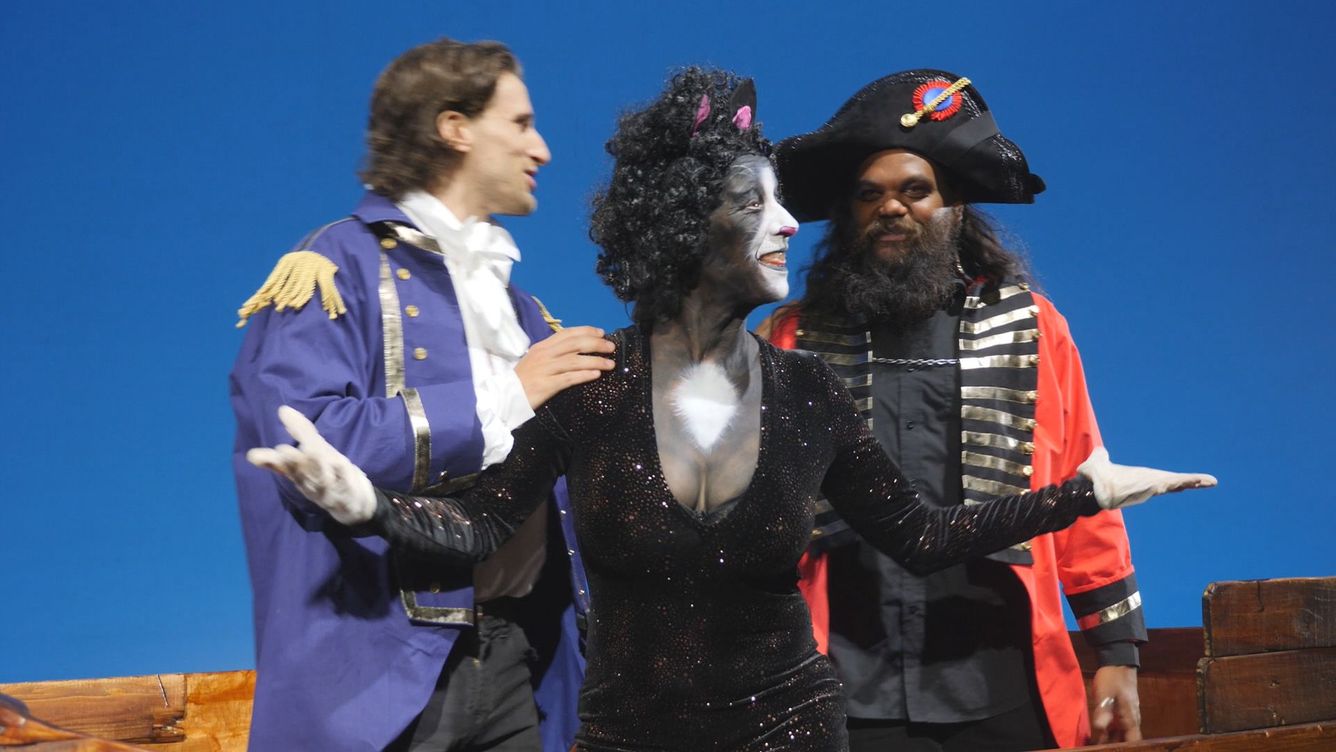 As musicians Chris Philips (Flinders) and Nicholas Williams (Bungaree) did vocal warm-ups, a make-up session transformed vocalist and multi-instrumentalist Gleny Rae into Trim, the cat that joined Matthew Flinders on his epic circumnavigation.