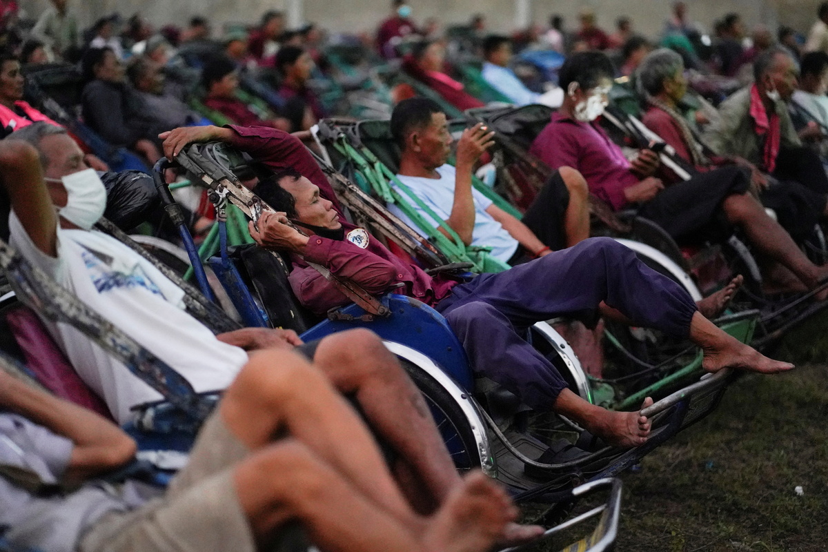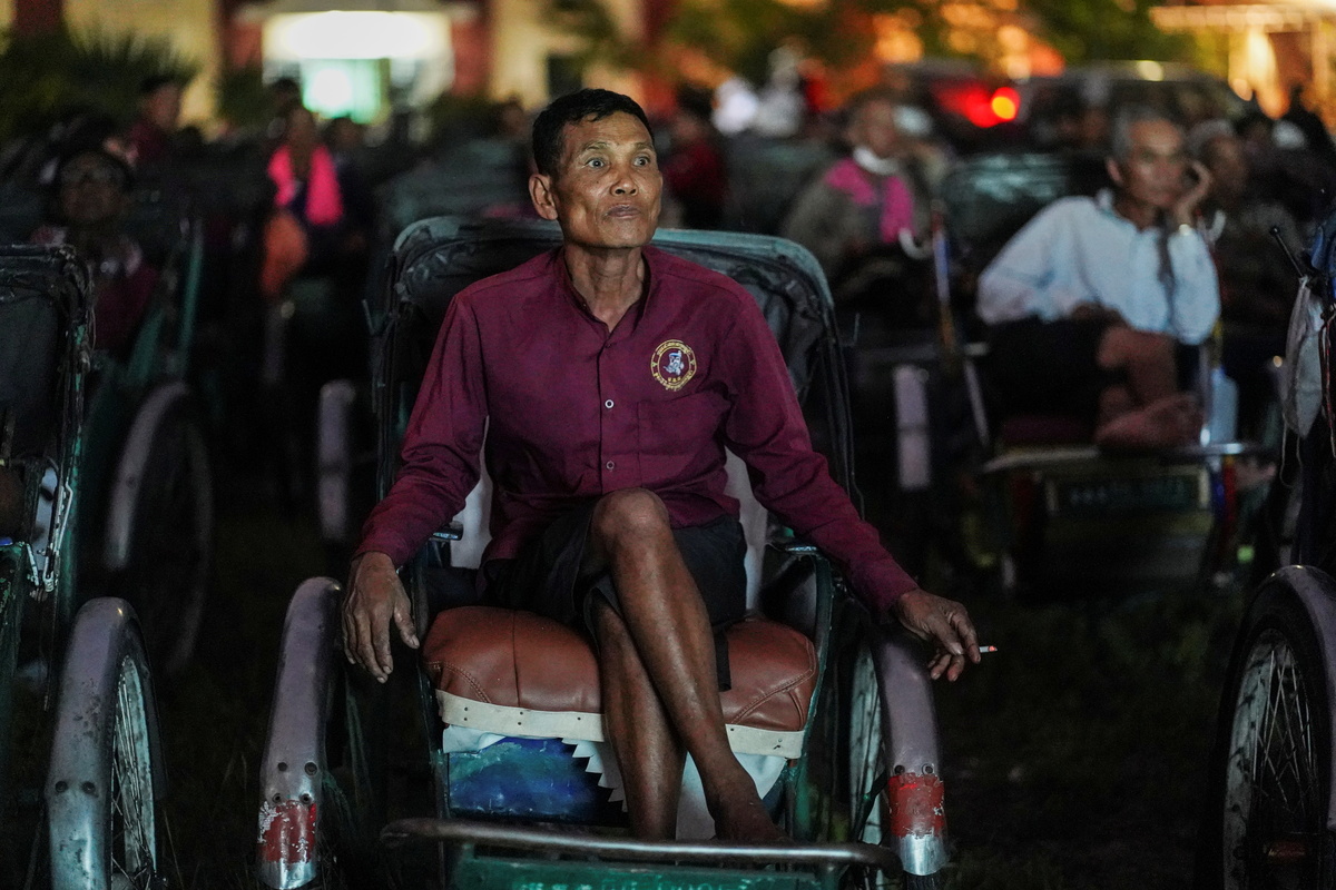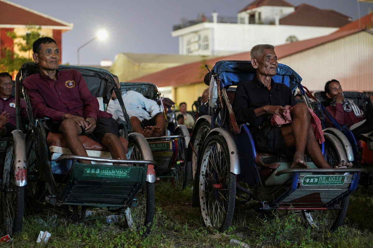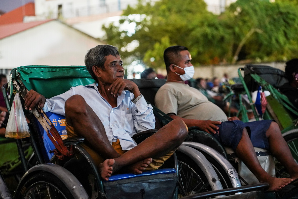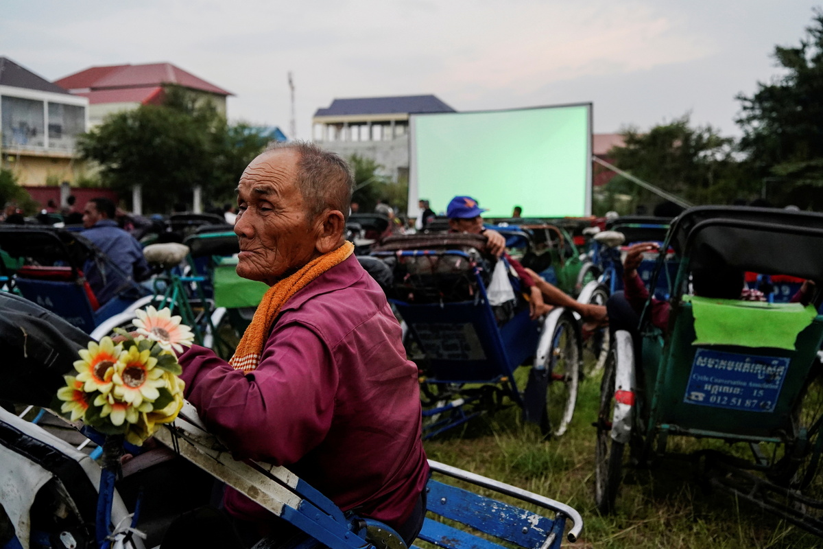 Hundreds of drivers who are struggling to make ends meet were seen sprawled out in their pedal-driven vehicles during the special screening on Saturday, when a makeshift movie theatre sprang up in a grassy yard in the capital Phnom Penh.