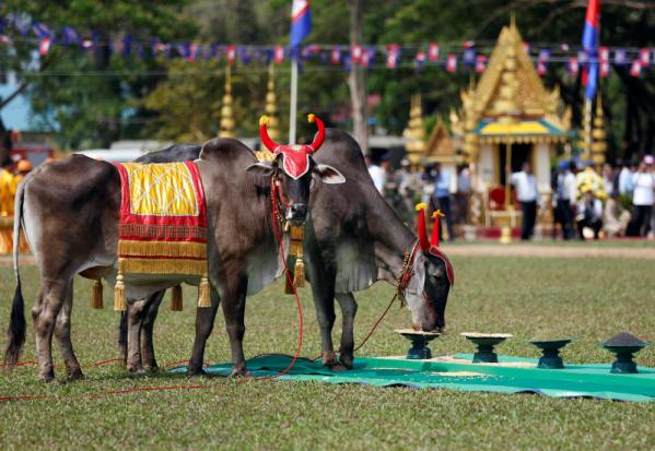 Cambodia's ceremony mirrors similar traditions in nearby Thailand and Myanmar in which oxen ceremonially plough the ground and then choose between eating bowls of rice, beans, corn water, grass, sesame seeds or alcohol.