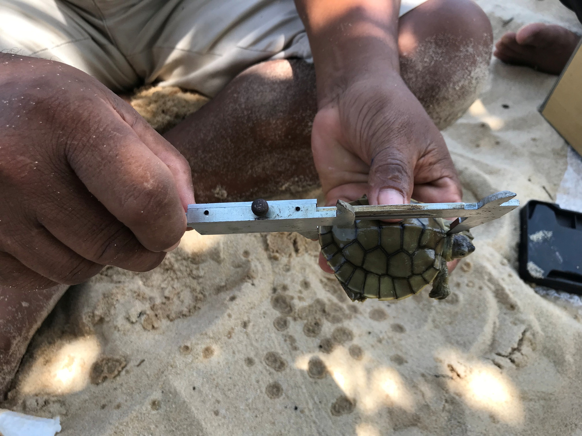 A man measures a turtle at Chheuteal Beach, where over twenty rare Royal Turtles have hatched thanks to conservation efforts to stop sand dredging along the turtles' habitat area, in Sre Ambel District, Koh Kong Province, Cambodia April 29, 2020. Wildlife Conservation Society/via REUTERS