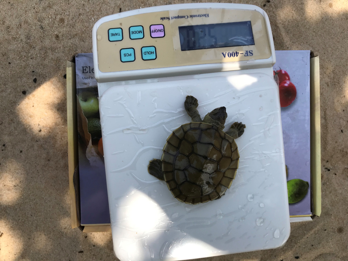A turtle stands on a scale as he is being weighted at Chheuteal Beach, where over twenty rare Royal Turtles have hatched thanks to conservation efforts to stop sand dredging along the turtles' habitat area, in Sre Ambel District, Koh Kong Province, Cambodia April 29, 2020. Picture taken April 29, 2020. Wildlife Conservation Society/via REUTERS NO RESALES. NO ARCHIVES. MANDATORY CREDIT. THIS IMAGE HAS BEEN SUPPLIED BY A THIRD PARTY.