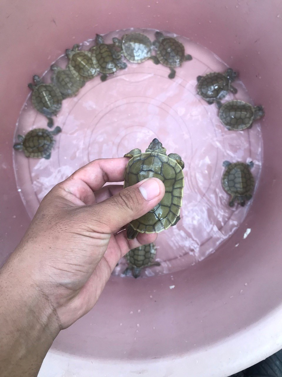 The baby turtles are each only a few inches long and were measured and weighed by the group. They will be looked after at a conservation centre before being released into the wild.