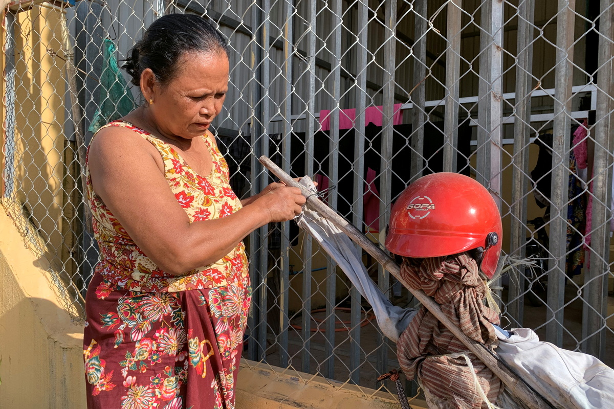 Ek Chan's two scarecrows, known locally as "Ting Mong", guard the gate of her house in Kandal province near the capital Phnom Penh, giving her peace of mind.
