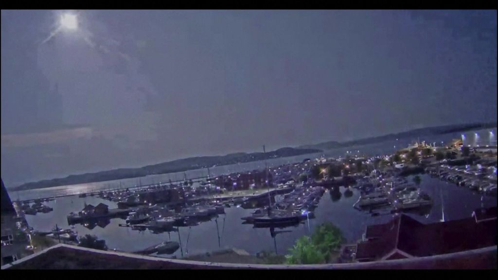 A web camera in Holmestrand, south of Oslo, captured a fireball falling from the sky and erupting into a bright flash lighting up a marina.