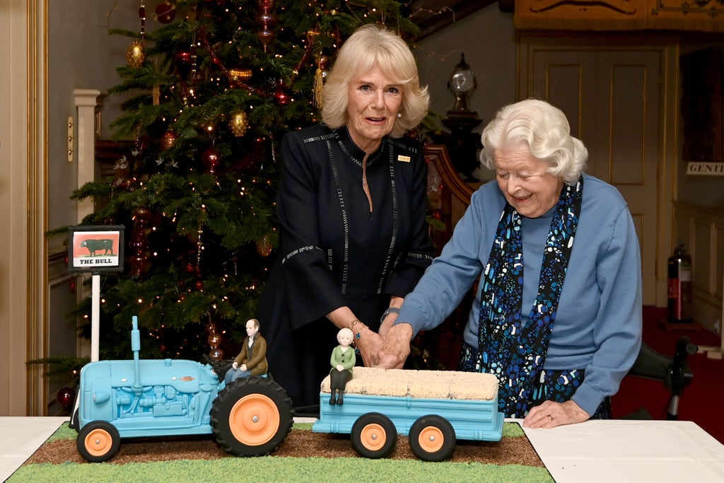 Camilla, wearing an Archers badge, was joined by June Spencer, the 102-year-old who plays Peggy Woolley and is the only surviving character of the soap’s original cast, to cut an Archers-themed tractor cake.