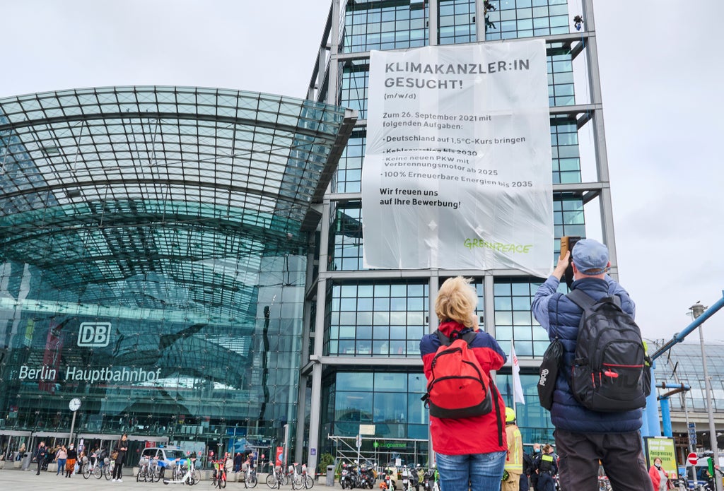 With 9 days to go before the German election, Greenpeace activists unfurled a three-story banner on Berlin s main train station designed as a vacancy ad seeking a new “climate chancellor.”