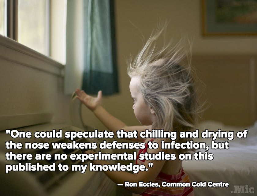 While that explanation seems clean and simple, there may not be any real science to back it up. Common Cold Centre director Ron Eccles told Mic via email, "One could speculate that chilling and drying of the nose weakens defenses to infection, but there are no experimental studies on this published to my knowledge."
