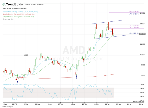 On the upside, the bulls want to see Advanced Micro Devices regain the 10-day moving average. Ideally, it will also clear the $126 to $127.50 zone, which is the 50% to 61.8% retracement zone of the current dip.