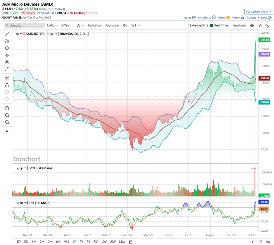 Still, with AMD trading hot above its Bollinger Band and momentum running full throttle, can the chipmaker sustain its charge toward $300 in 2025? Or is a pullback imminent?