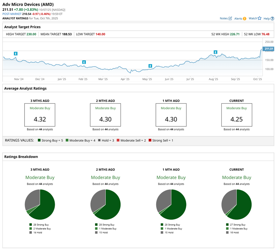 AMD stock has a “Moderate Buy” rating overall, reflecting solid confidence from the analyst community. Among the 44 analysts tracking the stock, 29 issue a “Strong Buy” rating, two back a “Moderate Buy,” and 13 advise to “Hold.”
