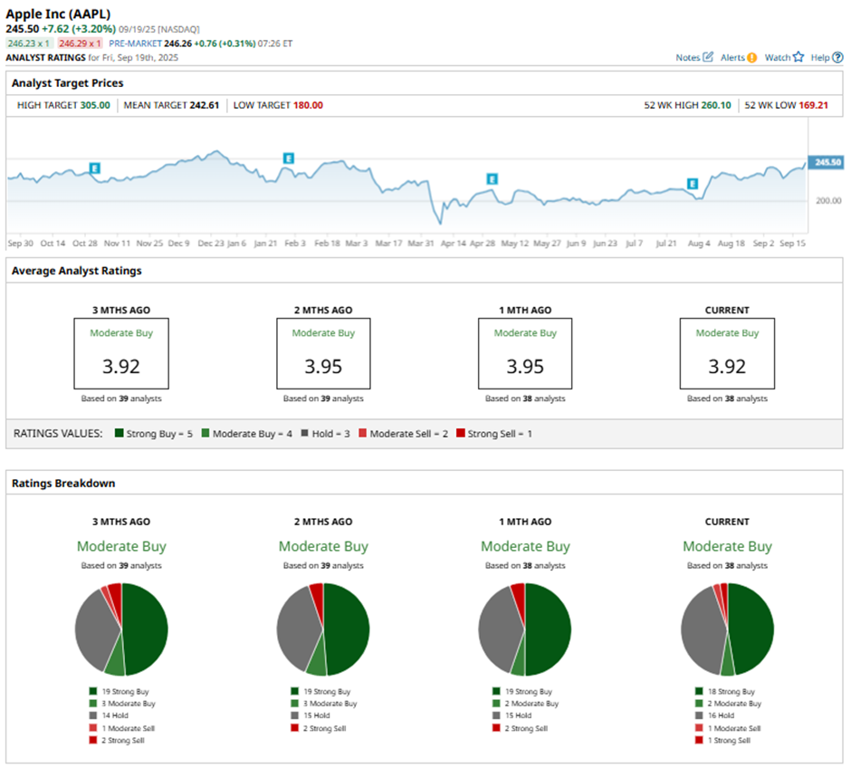 Apple stock has a consensus “Moderate Buy” rating overall. Out of 38 analysts covering the tech giant, 18 recommend a “Strong Buy,” two give a “Moderate Buy,” 16 analysts stay cautious with a “Hold” rating, one has a “Moderate Sell,” and one has a “Strong Sell” rating.