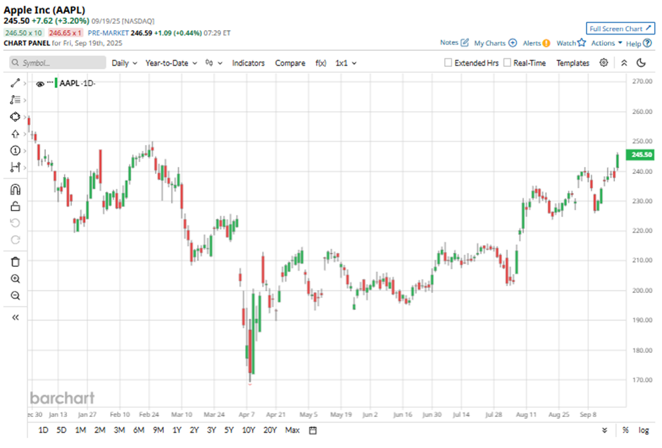 Apple has demonstrated a dynamic stock performance in 2025, marked by periods of volatility and recovery. On Sept. 22, the stock closed at $256.08, after surging 4.3% intraday driven by the launch of the iPhone 17 series, which has seen record-breaking demand. This surge in consumer interest has bolstered investor confidence, leading to upward revisions in price targets.