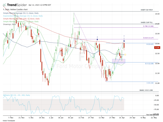 Ultimately, the bulls want to see a move over $13.25, opening the door to the $13.85 to $14 zone. That’s where Ford stock would find the 78.6% retracement of the pullback, as well as a gap-fill level from early February.