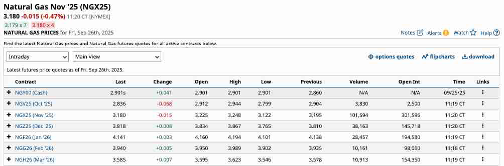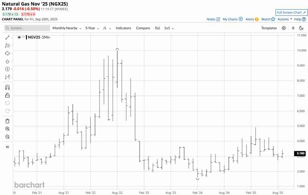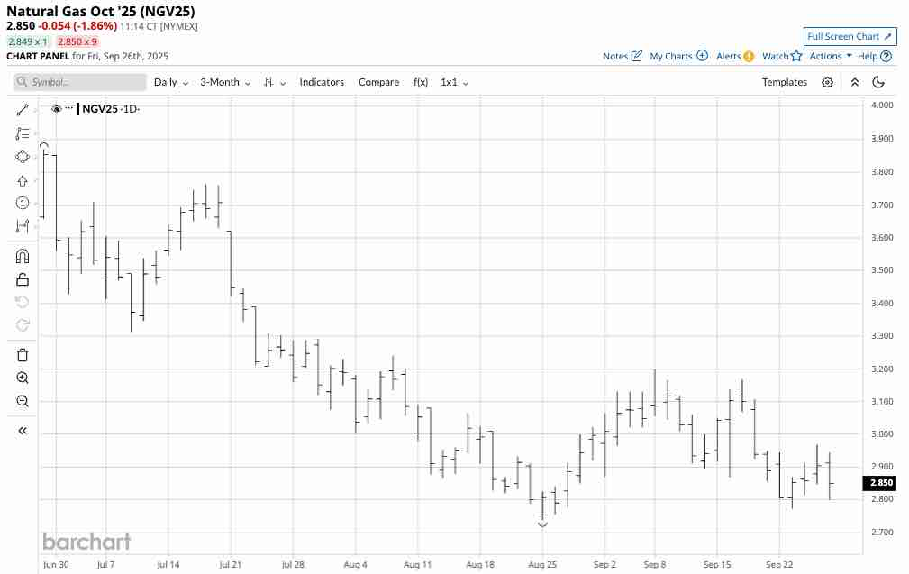 The chart of NYMEX natural gas futures for November 2025 delivery highlights the slightly bullish pattern of higher lows since late August 2025.