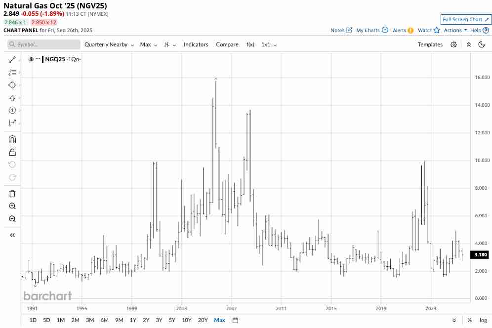 As the chart shows, the two factors that tend to push natural gas futures prices higher are the peak heating season and months when storms impact natural gas infrastructure. Natural gas prices traded in a $2.075 to $2.948 per MMBtu range in September 2024. In September 2025, the range was higher, between $2.850 and $3.419 per MMBtu.