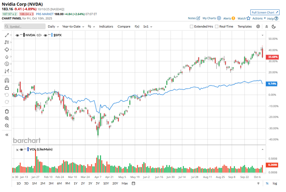 The company’s transformation truly began two years ago with the rise of OpenAI’s ChatGPT, which ignited the AI boom. Since then, Nvidia’s revenue has tripled, while profits have soared, cementing its place as one of the most remarkable success stories in modern investing. So far this year, NVDA stock has surged 35%, comfortably ahead of the broader S&P 500 Index’s ($SPX) 14.5% return. Shares reached a record high of $195.62 on Oct. 10 and currently trade about 7% below that peak.