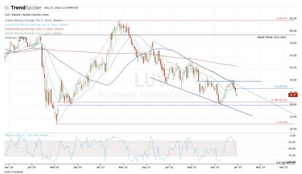 If Southwest stock moves back above $35, the bulls will want to see it regain the 10-week and 21-week moving averages, as well as the 50% retracement of the current decline.
