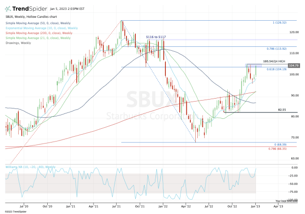 On the charts Starbucks stock has been enjoying a very strong trend and recently found support from the 10-week moving average. Now that it's trying to rotate through the 61.8% retracement, let’s see if the stock can clear last quarter’s high at $105.54.