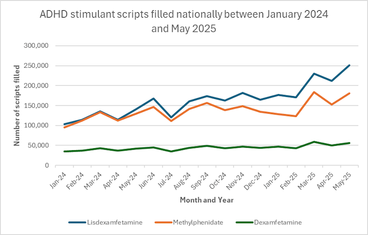 From January 2024 to May 2025, the number of prescriptions filled increased further, by 60% for dexamfetamine, 88% for methylphenidate and 140% for lisdexamfetamine.