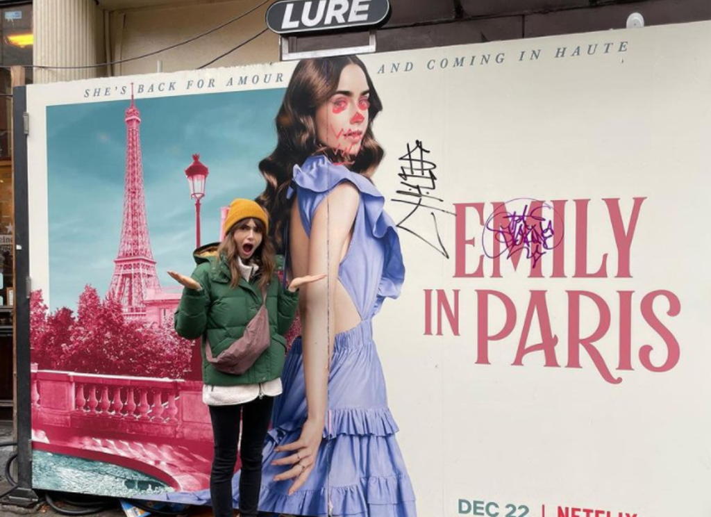 Lily Collins spotted a poster for her Netflix show Emily in Paris over the weekend, and was dismayed to find her character’s face was covered in graffiti.