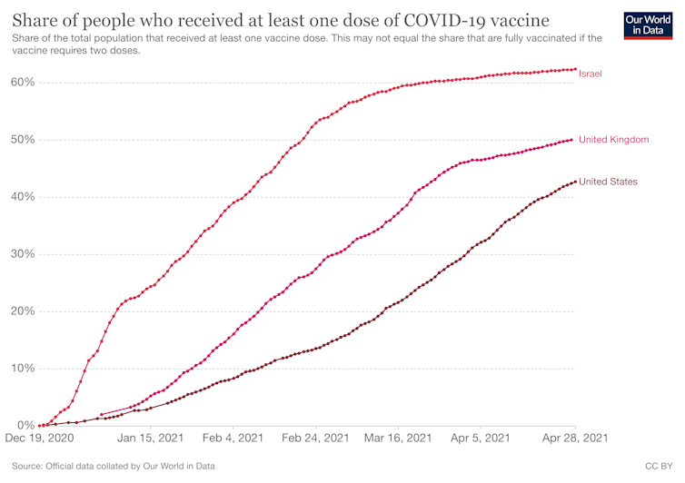 Vaccination levels, even in places like Israel where 62.4% of the population has been vaccinated, are still not high enough to fully protect against future outbreaks while relaxing all regulations. The government in Israel has lifted most – but crucially not all – internal regulations. The borders are, however, still closed to non-essential travel and masks are still worn indoors. Schools only reopened at 57% vaccination level.