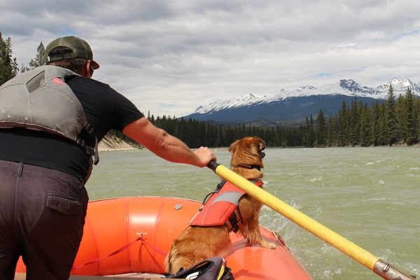 "It's funny" says Gere, who, as he spoke, was calmly steering a large rubber raft, a passenger and a dog named Ginger among rocks and swirls on the Athabasca River's bouncy near-Class II rapids, "because my own story of coming to Jasper is like that."