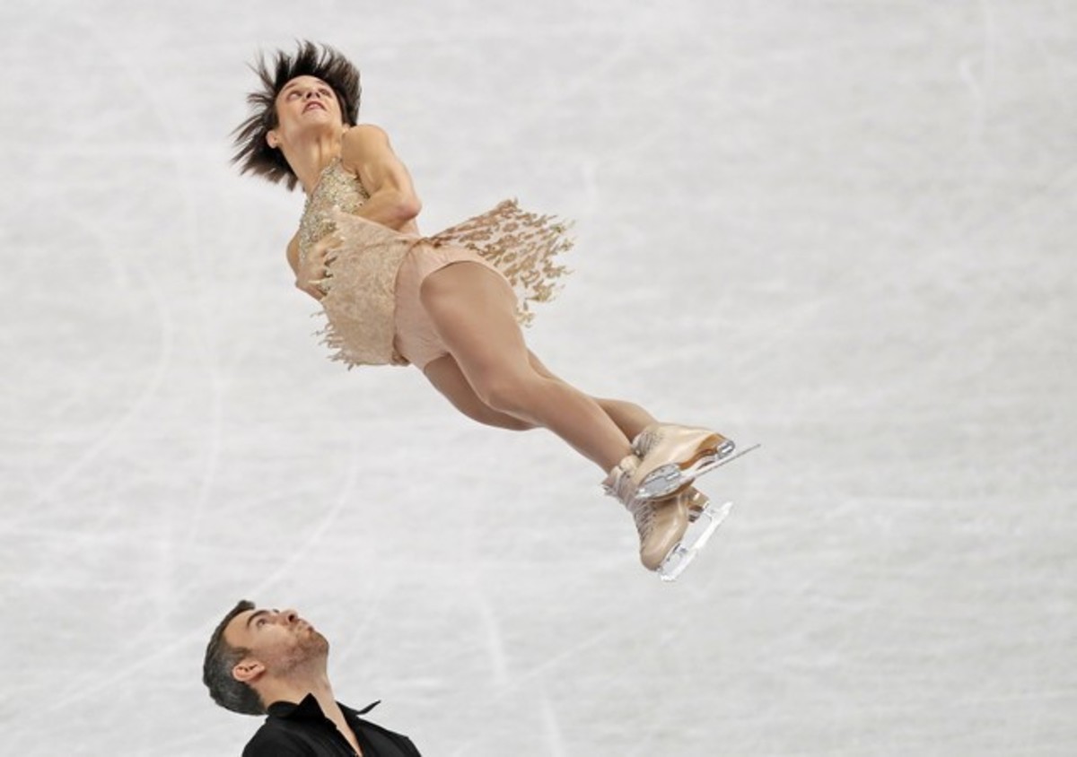In this element of their free programme, Radford tosses Duhamel, who spins four times in the air before landing backwards on one foot.